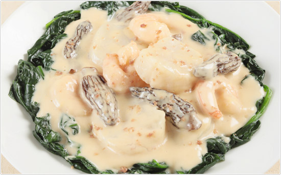ホタテ貝と海老をクリームと相性の良いモリーユ茸と共に ![]()