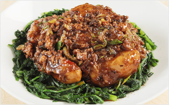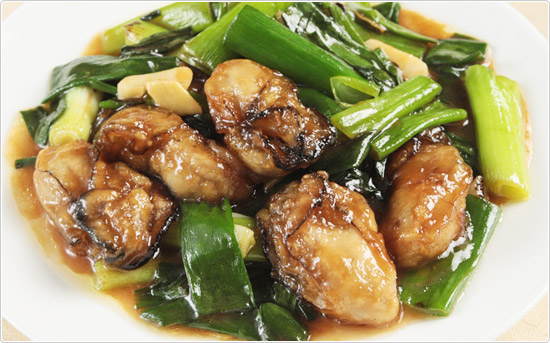 三陸産カキに九条ねぎとショウガを加え、オイスターソース味で炒めました。 広東料理定番のメニューです。